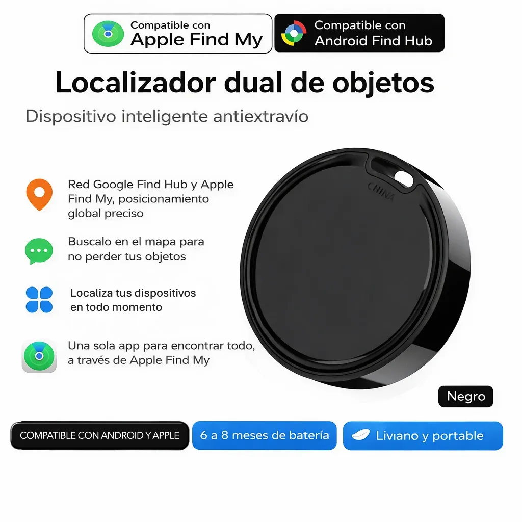 Localizador inteligente compatible con iPhone (Find My) y Android (Find Hub). No requiere descargar apps: funciona directamente con las aplicaciones nativas del celular. Permite encontrar objetos en segundos con alcance global.