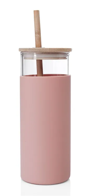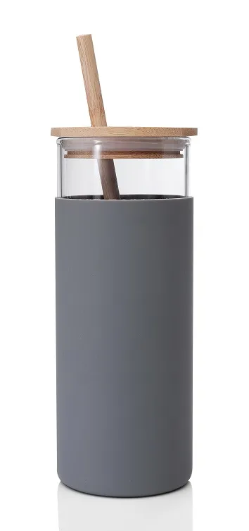 Botella de vidrio borosilicato con sorbete y tapa de bamboo.